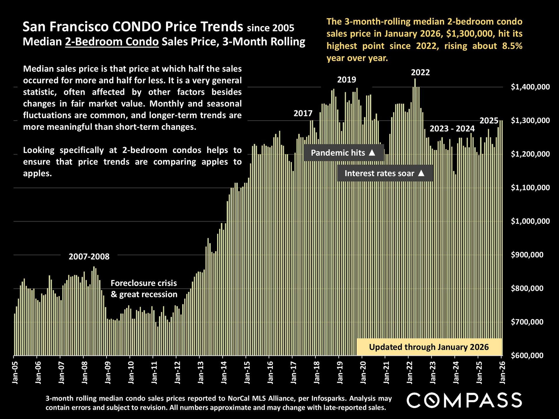 Yes—and the rebound is accelerating. The condo market, which took a significant hit during the pandemic years, is now showing real momentum. The median 2-bedroom condo price reached $1.3 million in January, its highest point since 2022, rising about 8.5% year over year. For buyers considering luxury condos in neighborhoods like South Beach, Yerba Buena, or Mission Bay, this trend is worth watching closely.
