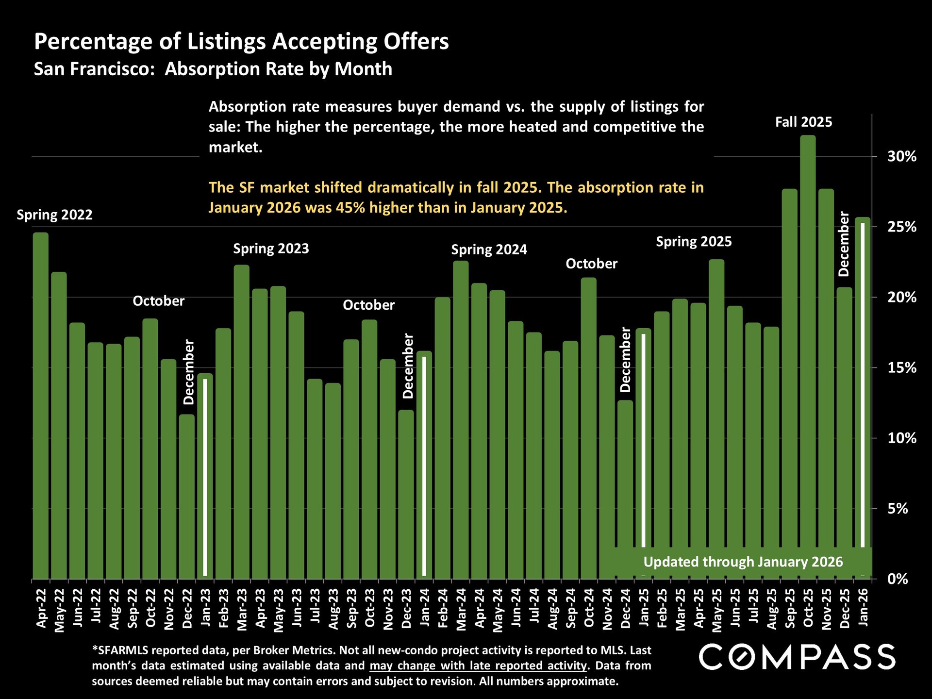 The demand indicators are equally striking. The absorption rate in January—which measures buyer demand relative to the supply of available listings—was 45% higher than January 2025. Price reductions dropped 33% year over year, a clear sign that sellers are pricing with confidence and buyers are meeting them there (or above). And 46% of all sales closed over asking price, up from 37% a year ago.