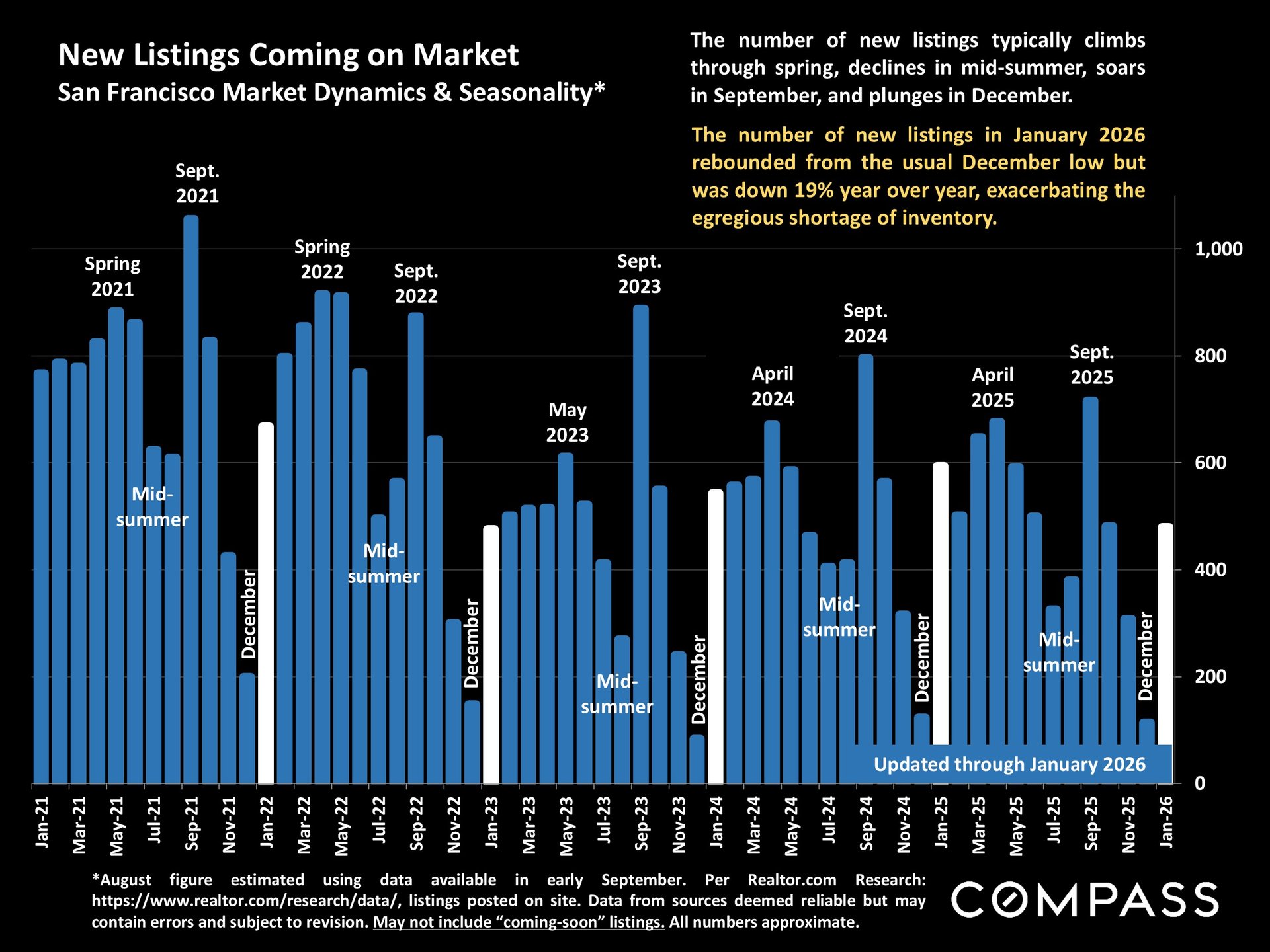 Several factors are converging: new listings in January were down 19% year over year, buyer demand is rapidly absorbing what does come on the market, and many potential sellers are staying put due to favorable existing mortgage rates. As of February 1, only 651 homes were listed citywide—down 27% from a year ago.