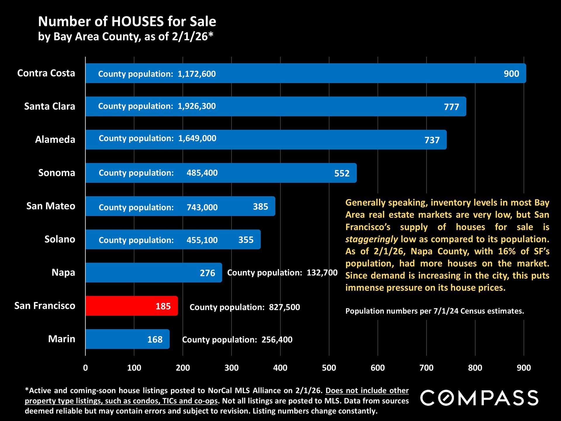 While much of the country debates whether spring will bring a surge of new supply, San Francisco’s inventory just hit its lowest February count in over four years. As of February 1st, just 651 homes were on the market—down 27% from a year ago. To put that number in context, only 185 of those are houses. Napa County, with roughly 16% of San Francisco’s population, currently has more houses listed for sale.
