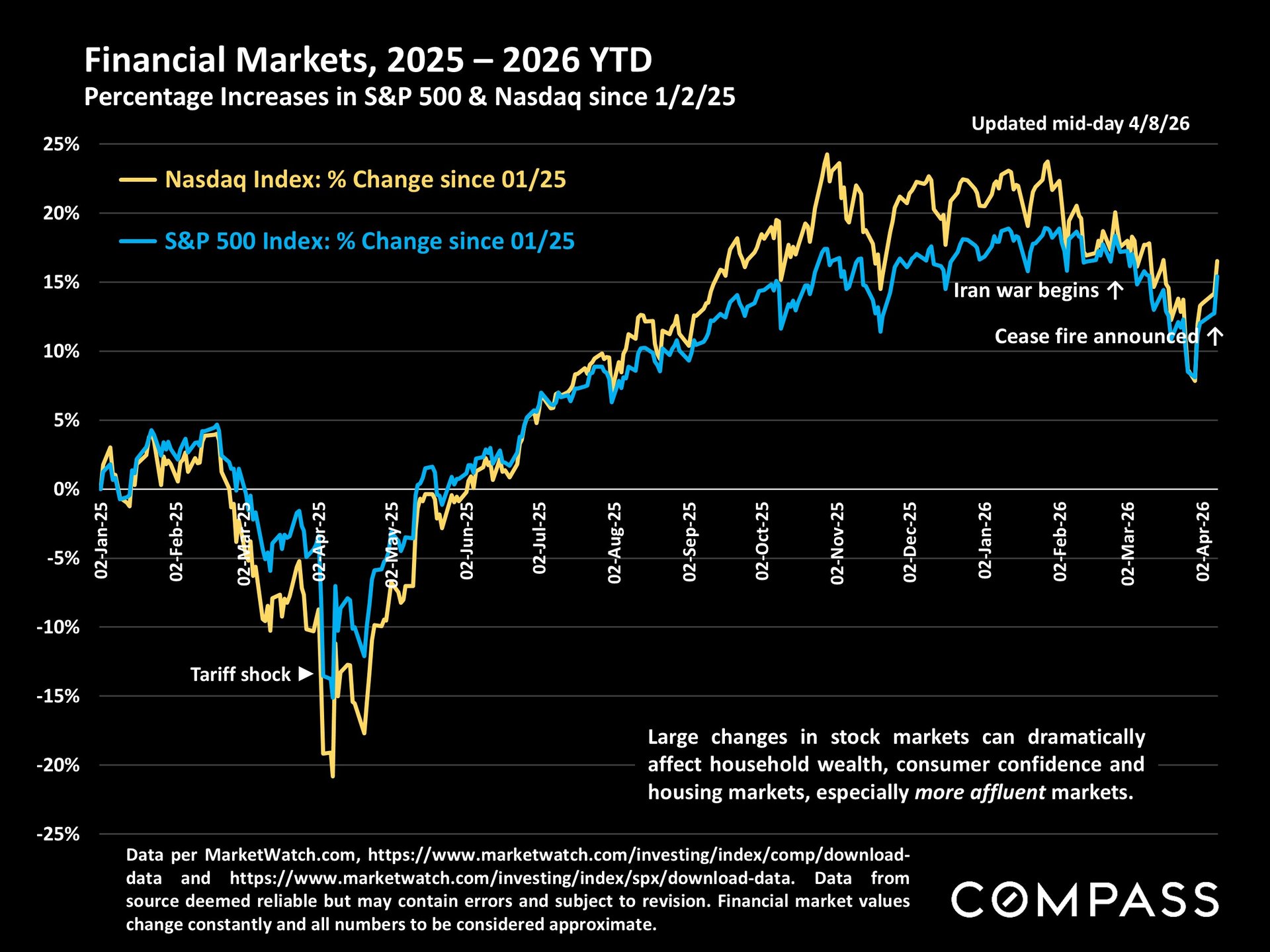 On the equity side, financial markets have more than recovered from the conflict. The S&P 500 closed above 7,000 for the first time on April 16, and the Nasdaq posted its 12th consecutive daily gain, the longest winning streak since 2009. That strength supports the wealth effect that drives much of San Francisco's upper-tier activity. The Federal Reserve held the fed funds rate steady at 3.50–3.75% at its March meeting per FRED, with the next decision set for April 29. Markets are pricing in no cut until at least September, but the rate environment is still materially more accommodative than it was two years ago.