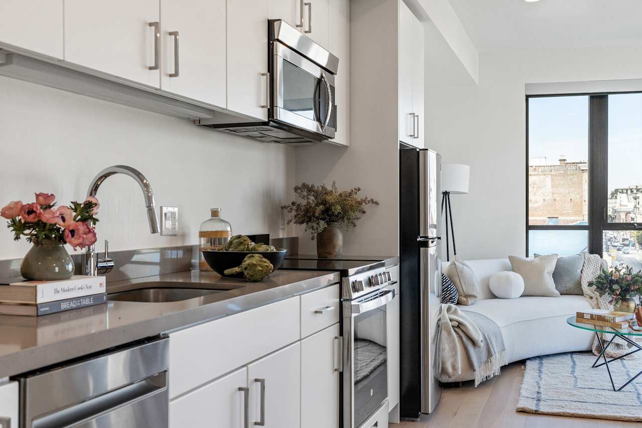 The finishes in the units include LED disc lights in the living and bedroom areas and undercabinet lighting in the kitchen and bathrooms. The appliances are Energystar rated and include a GE fridge, range, cooktop, hood, and dishwasher. The custom kitchen cabinets and bathroom vanities have been manufactured by artisans in Portland—featuring a soft close and minimalist look. The wall tile is Oh La La, the floor tile is Dolmen Gris Rustico, and the countertop is Pebble Ceaserstone polished. The wood flooring is European Oak with a Vicenza finish and thinner planks that show the natural wood grain and tones.